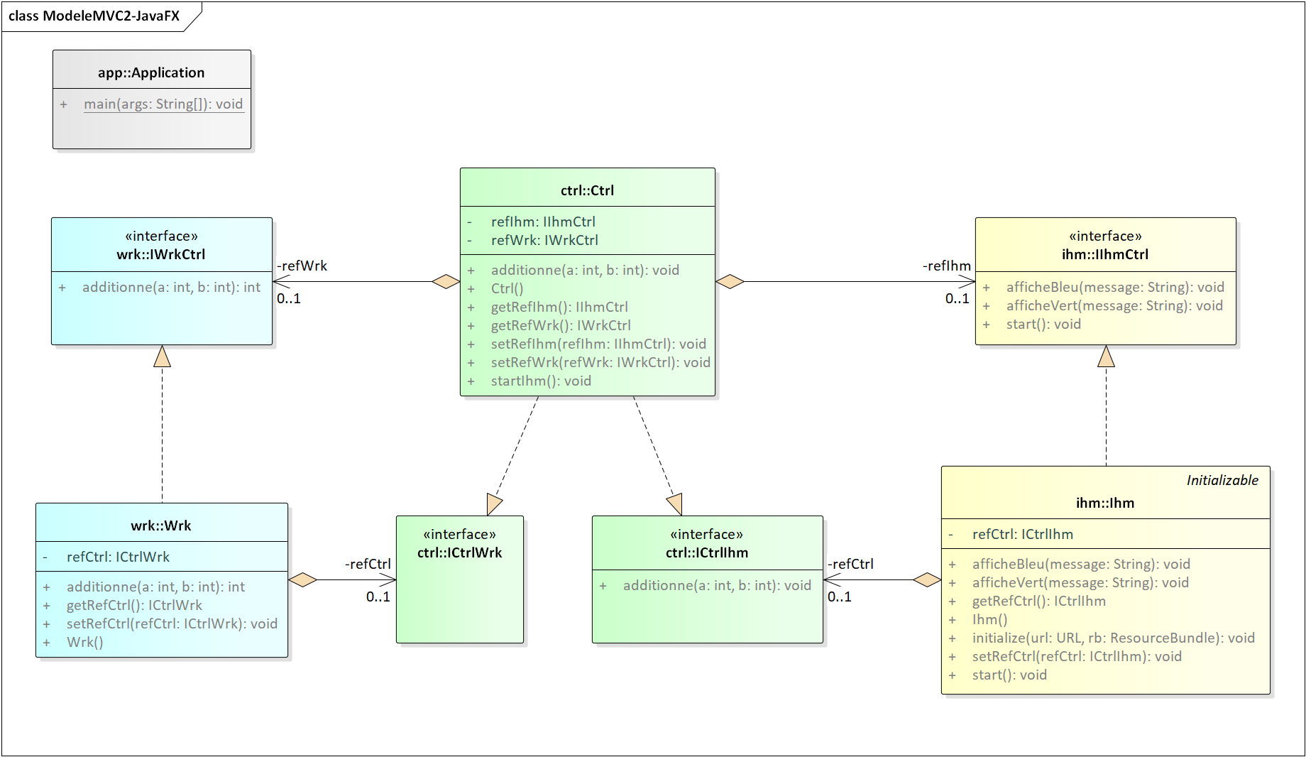 Or ce n’est pas forcément « évident et trivial » de trouver comment faire pour proprement utiliser cette technologie JavaFX dans une architecture MVC2. Car (et ce n’est pas une critique mais un constat) JavaFX a une architecture interne un peu particulière, à commencer par le fait qu’il souhaite démarrer lui-même l’application et lui-même créer les instances des contrôleurs de chaque ihm, ... ce que l’on ne souhaite bien évidemment pas en MVC2.